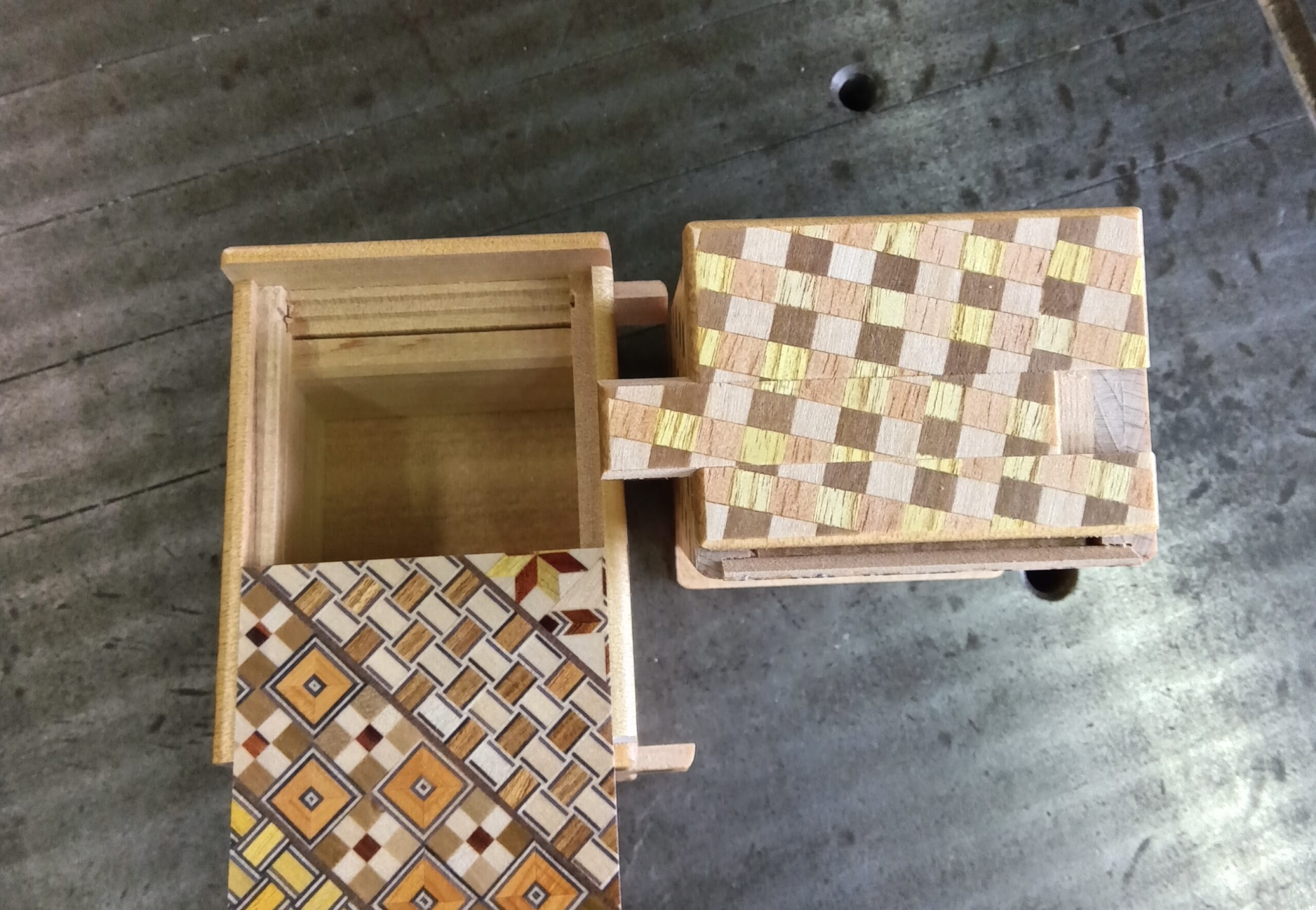 Also this time, there were a few boxes where the sliding keys had a bit of interference. By “interference,” I mean that when the sliding key moves, it doesn’t move smoothly—it slightly catches on the fixed parts above and below the panel, making the movement feel stiff. In my experience, this tends to happen more often in 14-step and 18-step boxes, and less in 21-step or 27-step ones. The reason is that in the 14-step and 18-step designs, the sliding key moves a longer distance in a single step. This kind of interference is not caused only by the sliding key itself, but also by the relationship between the small wooden parts attached to the key inside and the movement of the Aruki panels. It’s not easy to adjust and make the movement smooth again, but there are ways to do it. Today, I had to adjust several boxes, but I was able to bring them back to a smooth movement safely.