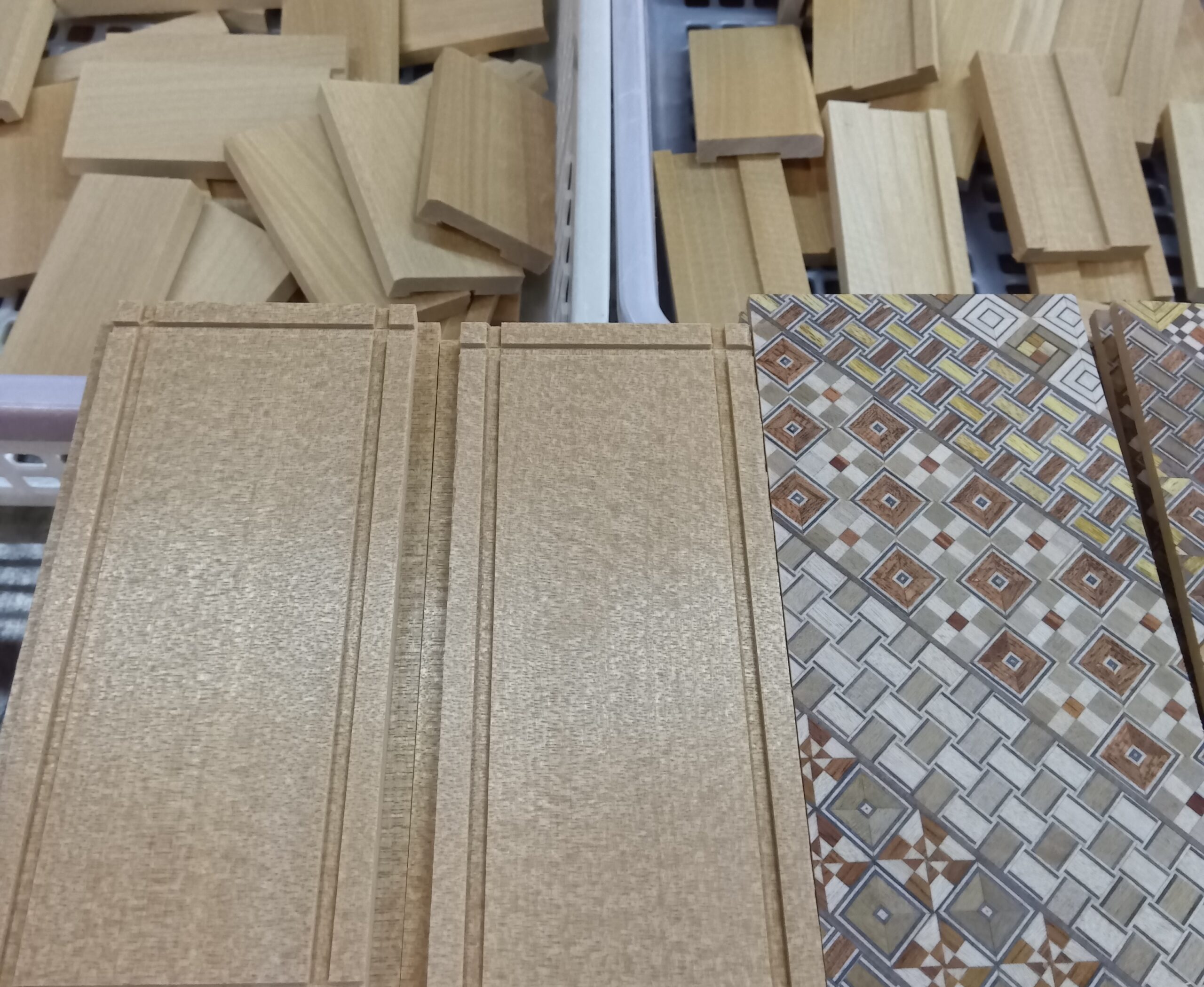 In the afternoon, I made the frame parts for a 5-sun 36-steps puzzle box, like in the photo. The photo shows the left and right side panels, and two kinds of axle panels. These parts are exactly the same as the ones for the 27-steps boxes. The grooves on the side panels are also cut in the same place as the 27-steps boxes, about 8.5 mm from the edge of the panel. This means the thickness of the Aruki moving panels is 8.5 mm.