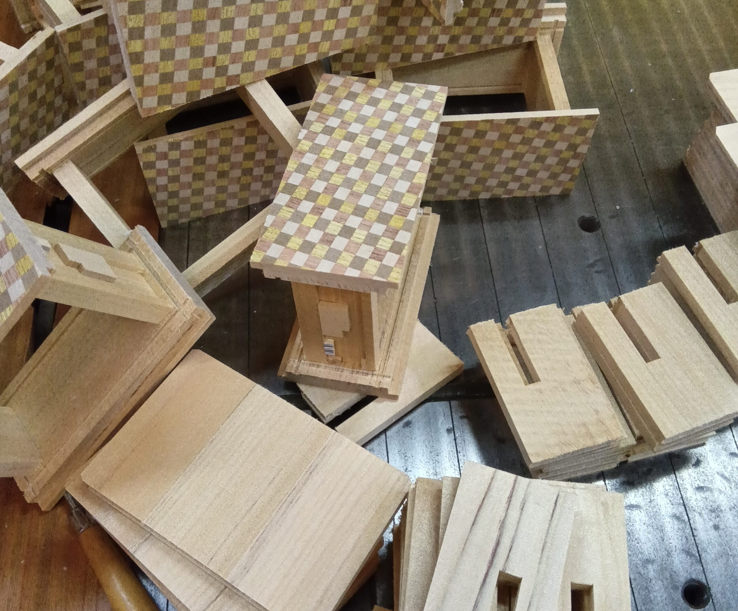 I also began preparing for the next project, the 4-sun 27-steps boxes. The first step is attaching the Yosegi sheets. I prepared boards for attaching the two-color Ichimatsu Yosegi sheets for the side panels, and also MDF boards for the top and bottom panels. For now I plan to use the two-color type of Ichimatsu Yosegi, but it is not fixed, so I may change it. Since I have used the usual four-color type for the past two projects, I thought it might be nice to do something different this time.
