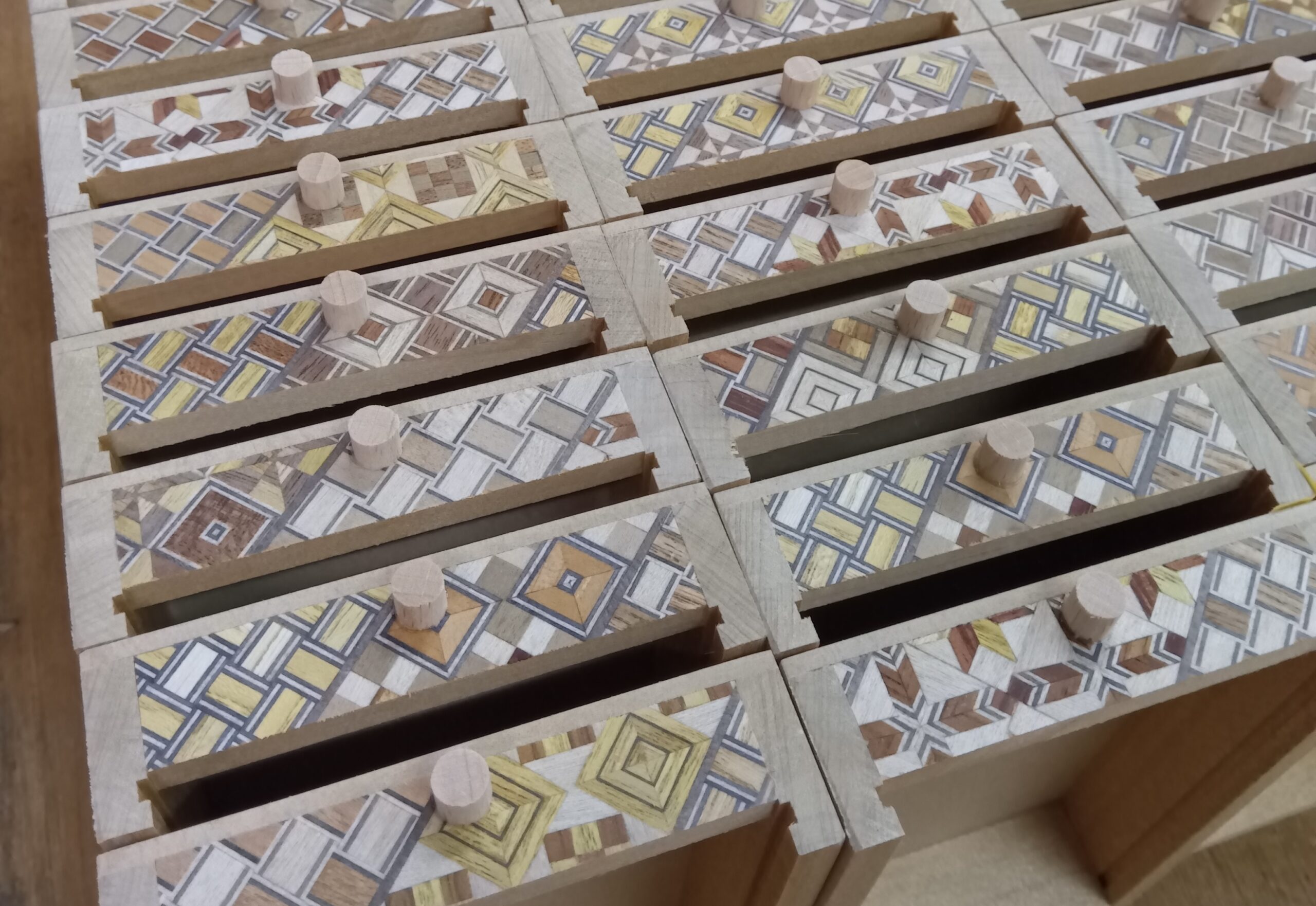 Today, I mainly continued working on the 5-sun puzzle box with drawers, but in between I also moved forward with the preparation for the 4-sun puzzle boxes. For the 5-sun box, I worked on making the drawers. I had already made the frame parts earlier, but this time the lid panels took a little more time to complete.