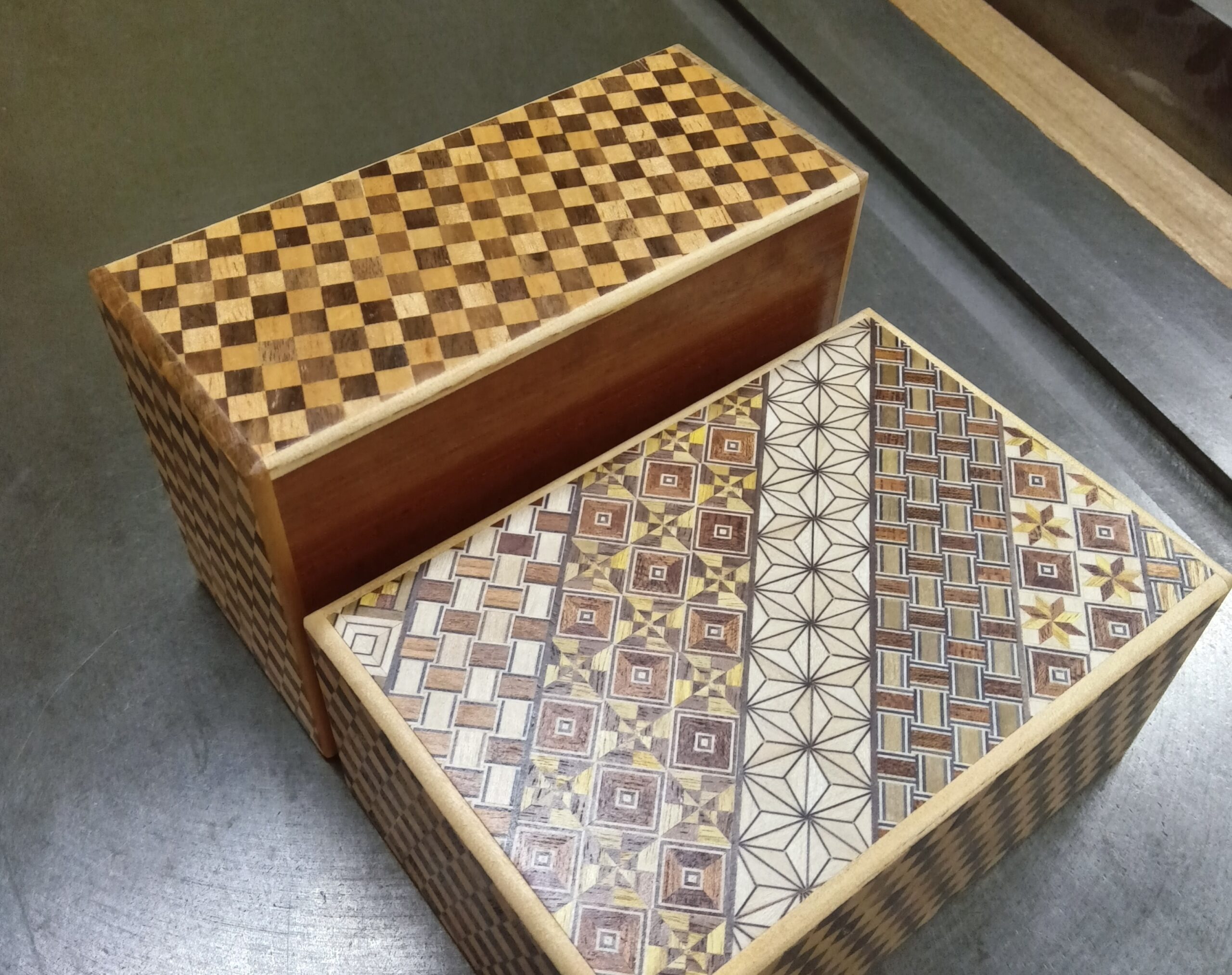 And in the evening, the 5-sun puzzle box was fully finished after the finish coating was applied. This time, it has a 14-step mechanism. Recently, a customer who bought a 6-sun puzzle box (made this month) that uses the same checkered yosegi (ichimatsu) on the side panels said, “This checkered yosegi feels like a retro style from the 1950s. It’s beautiful!” I hadn’t noticed that myself until they said it…haha 😅. But yes, I agree—it has a calm, tasteful, and slightly subdued feeling. I have used walnut and nato wood many times before, but I may not have combined only these two woods together until now. It was a new and interesting discovery for me. Thank you! 🙏