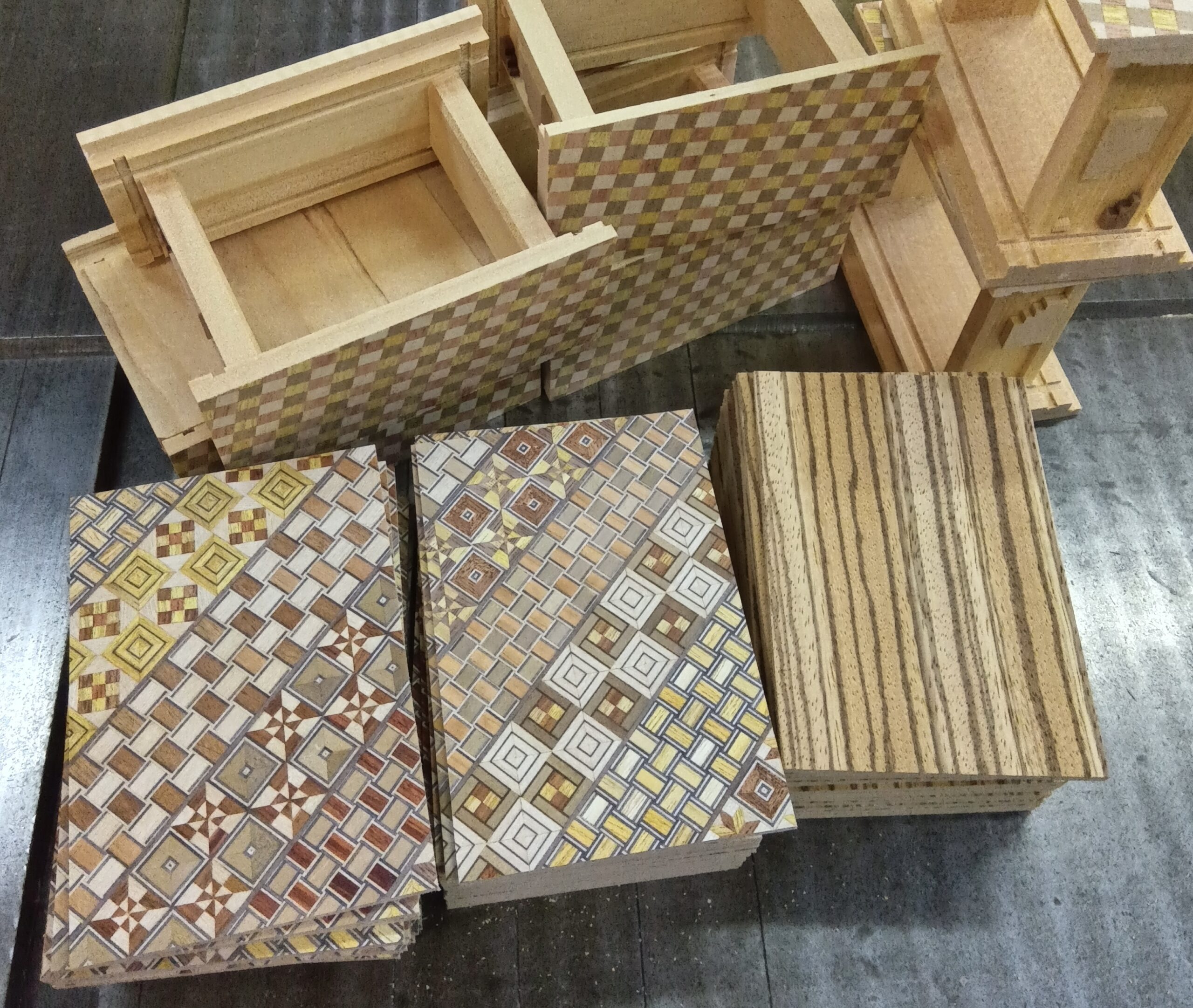 As I wrote yesterday, I’ve started making new Mame (tiny) puzzle boxes. But the yosegi sheet panels I glued yesterday haven’t dried well, so today I worked on the 4-sun 27-steps puzzle boxes that I’ve been making for a while. I made the Aruki panels and attached them, then I also attached the yosegi and zebrawood panels for the top and bottom sides. This time, I added as many traditional yosegi panels for the top and bottom sides as possible, since they’re always popular. I’m also making more of the zebrawood type again, as the stock is running low.