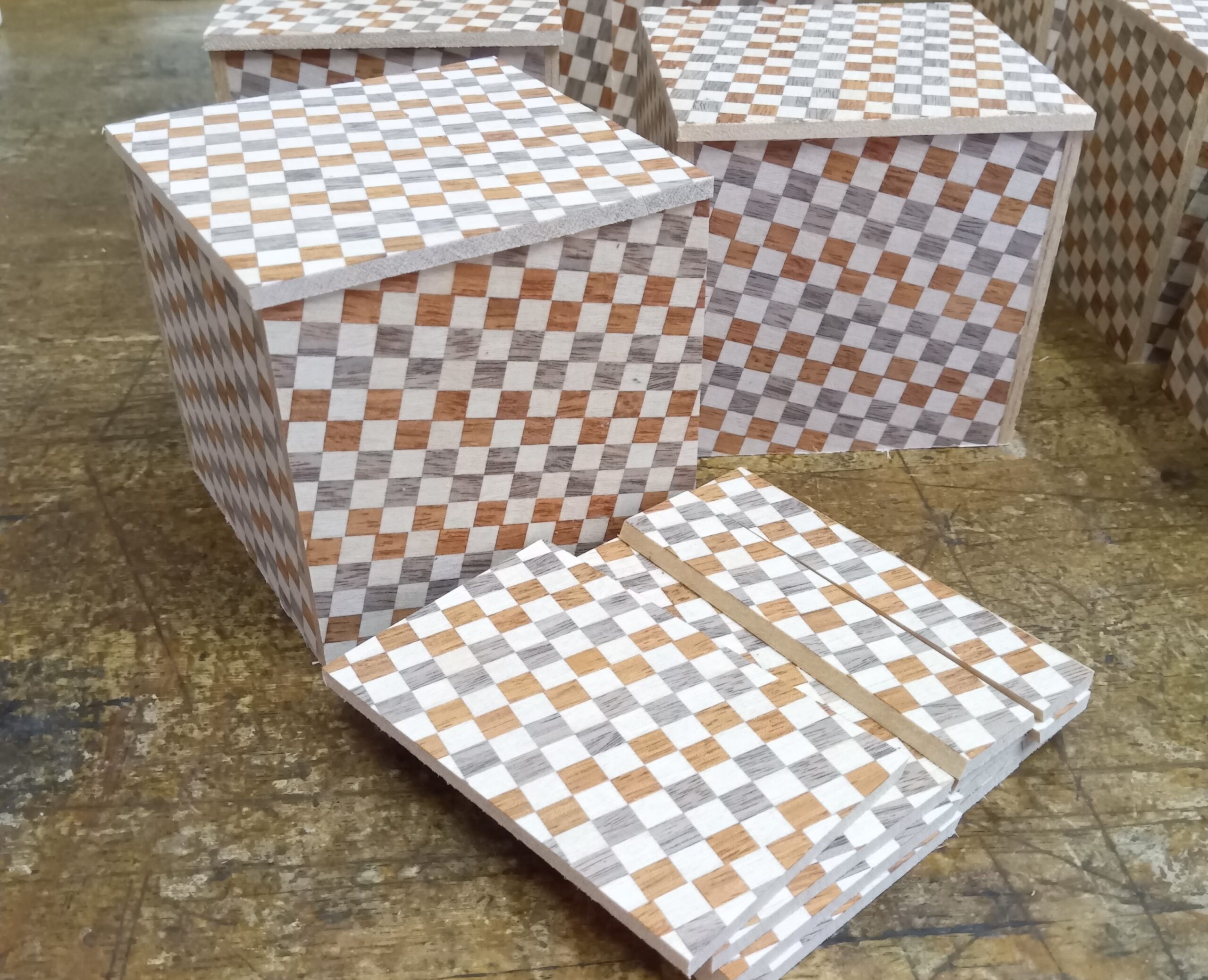 Next, I make the sliding key panels. A single board is divided into three pieces by cutting it with angled lines. The dimensions of these panels vary depending on the box, but this time, they are almost the same size as those used for the 5-sun boxes.