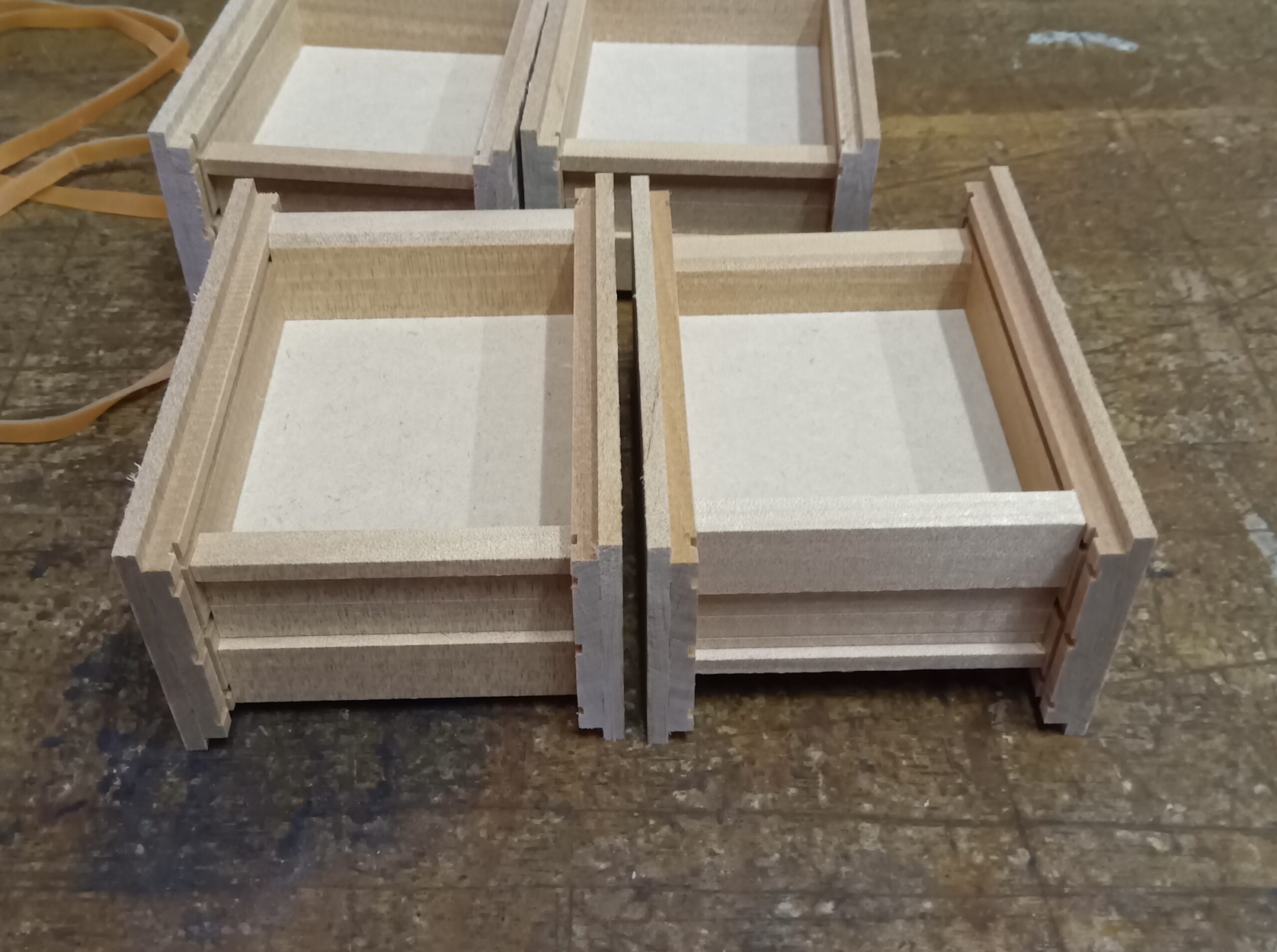 For the 3-sun boxes, I attached the sliding key panels as planned. This time, I am preparing two types: one with Ichimatsu yosegi sheets and the other with solid walnut. The production method is mostly the same, but if possible, I make the walnut panels slightly thicker—just a little, about 0.1 to 0.2 mm. A bit more thickness seems to help prevent warping. For the Ichimatsu yosegi panels, the yosegi sheet on the surface helps reduce warping. That is also one of the reasons why many Japanese puzzle boxes use yosegi. Since puzzle boxes are made by attaching thin panels around the box, they can easily warp with changes in the environment. This time, since it is a 3-sun size, it is more resistant to panel warping compared to larger sizes, so there is not much to worry about.