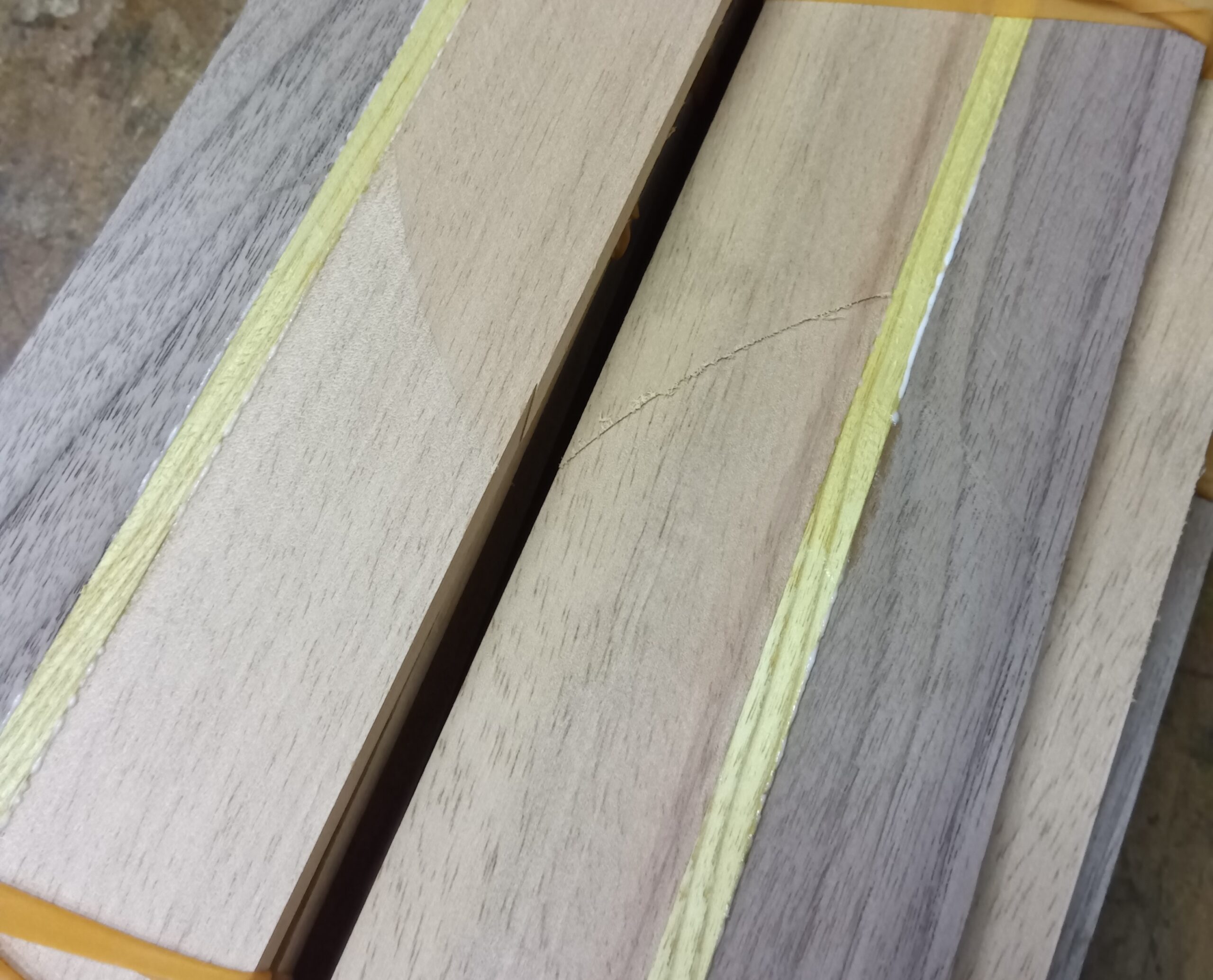 It was rainy until early this morning, but once the rain stopped, the humidity wasn’t too high.So I resumed work on the square puzzle boxes, making and attaching the sliding key panels that I had put on hold. I finished one side today and plan to attach the other side tomorrow.This time, I’m making three different design types. One of them uses the traditional yosegi pattern, but since I ended up with more walnut panels than expected, the yosegi type has the traditional yosegi on the top panel only, while the bottom panel is made of walnut. The limited solid wood edition features solid wood panels on both the top and bottom.