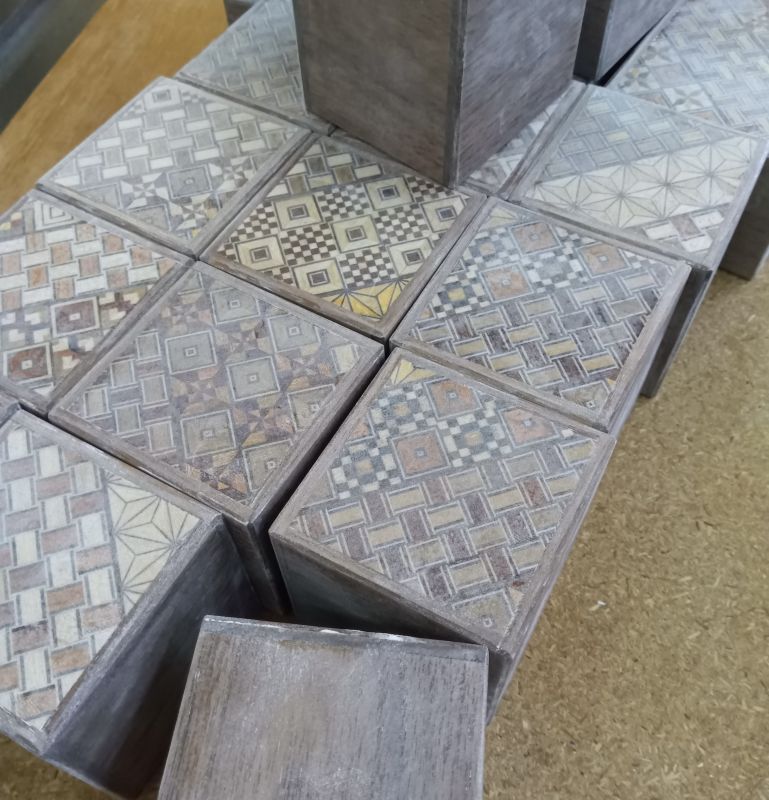 Today, I am sanding several Japanese puzzle boxes with sandpaper for the finish coating (painting). These are four different types of boxes in small quantities: 2-sun cube, 3-sun, 4-sun and Square sizes. These are made-to-orders, and I am making more of each size, but I am finishing only the necessary ones first.