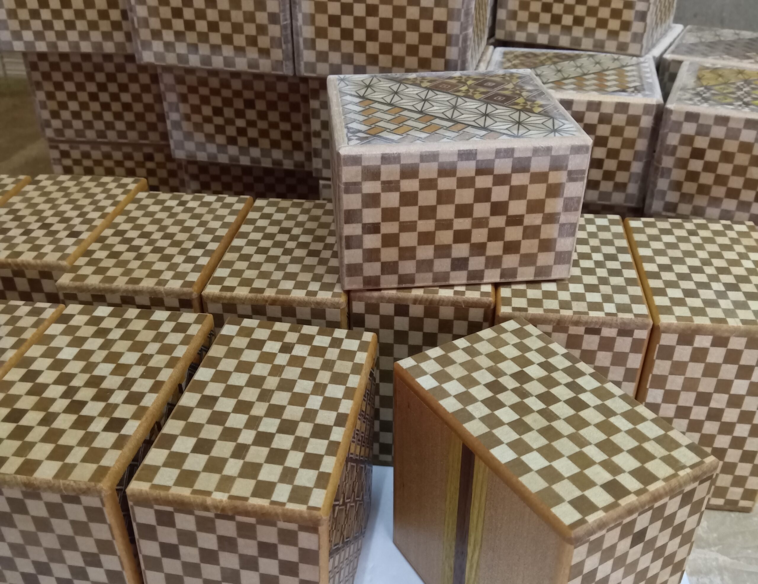 The square puzzle boxes finished their painting process today, and I will check each box next. Today was the second coat of paint. I usually paint my puzzle boxes twice. Yes, it means two coatings. The first one is the base coat, and the second one is the top coat. Since puzzle boxes have several moving parts on the surface, if the coating is too thick, those parts can stick together and stop moving. Even with one thin coat, the parts will stick a little, but they can be moved quickly. However, if the coating is too thick, it forms a kind of plastic-like film on the surface, and the parts will not move even if you apply some force. After a lot of trial and error, I found that two coats are the best. But even with two coats, there is a difference between two thick coats and two thin coats. I adjust this by controlling the amount of paint. I apply two coats using just the right amount of paint. With only one coat, the surface still feels rough and does not become smooth. It also becomes more sensitive to humidity and temperature changes from outside. With two coats, the box is better protected, and the surface looks much nicer. Of course, the mechanism sticks a little after painting, but if you apply a bit of pressure, it will move. I adjust this by controlling the amount of paint. When the coating begins to dry, I move the mechanism once so it will not stick again. So after the first coat, I move the mechanism once, and after the second coat has dried, I move it again. If I don’t move it at the stage after the first coat, it becomes very difficult to move the mechanism later during the final check.