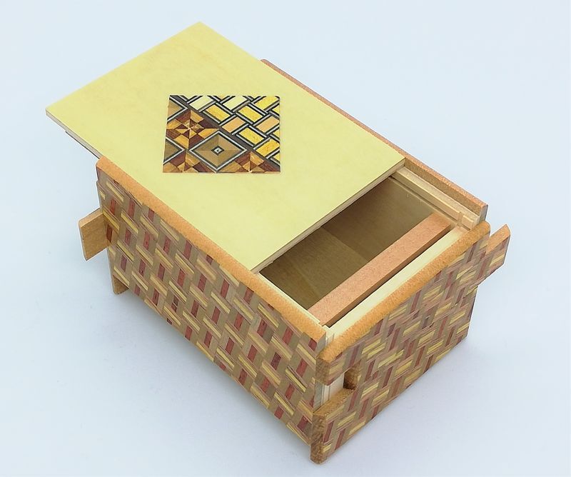 I made it around 2018 to 2019. The size of the box in the photo is 3-sun, and there are versions with 7-step and 12-step mechanism. After making this size, I also made a 4-sun size. Even though the cost of the yosegi sheet is low, it is quite difficult to properly attach the sheet to the center and corners of the box’s lid panel. This is because when cutting the yosegi sheet to this size, the yosegi sheet might become disjointed.