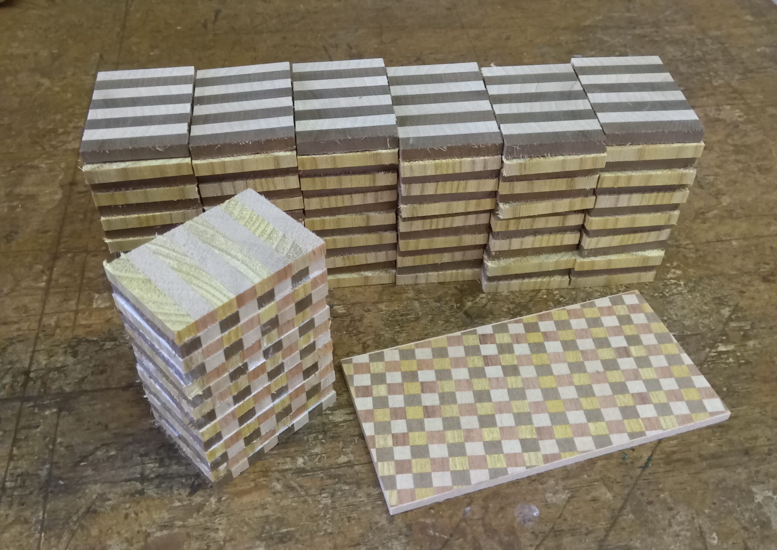 I prepared the materials last year and had already cut them into small parts, so the next step is to glue them together one by one (photo). First, I glue fourteen small pieces together to make one block. Then, when seven of these blocks are joined, the size becomes about 34 cm in length and 6 cm in width. This is the size needed for 4-sun and square puzzle boxes. Today, I finished making seven blocks. Next, I will glue them as two groups, one with three blocks and one with four blocks, and finally join those two groups together to make seven again. I will continue this gluing work little by little in between making boxes over the next few days. The actual gluing only takes a few minutes, but after that, the pieces need to rest for several hours. That is why I always do this work in between other box-making tasks.For the time being, I am thinking of continuing to make both the two-color ichimatsu yosegi that I added last year and this four-color type.