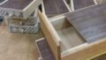 All the boxes in this batch have the same checkered yosegi design, so just like with other Japanese puzzle boxes, I round off the corners. After that, I repair any small defects in the yosegi pattern. This time, the checkered pattern turned out really well, but during the slicing process, small chips can still appear in the design. Among the three colors used, the reddish Rengas wood is especially hard and has irregular grain, so it doesn’t slice easily. Generally, harder woods or those with coarse grain are more difficult to slice cleanly. About 90% of the small repairs this time were on the Rengas sections. The repair process is done by cutting a small piece from a spare Rengas sheet to match the size of the missing area, gluing it in place, and then sanding it smooth to blend it in. That’s why it’s essential to keep some extra pieces from the sliced yosegi blocks for future repairs. Most of the damaged spots are about 2 to 4 millimeters in size. Filling those tiny gaps can be tough—especially if your eyesight isn’t as sharp as it used to be 🤣