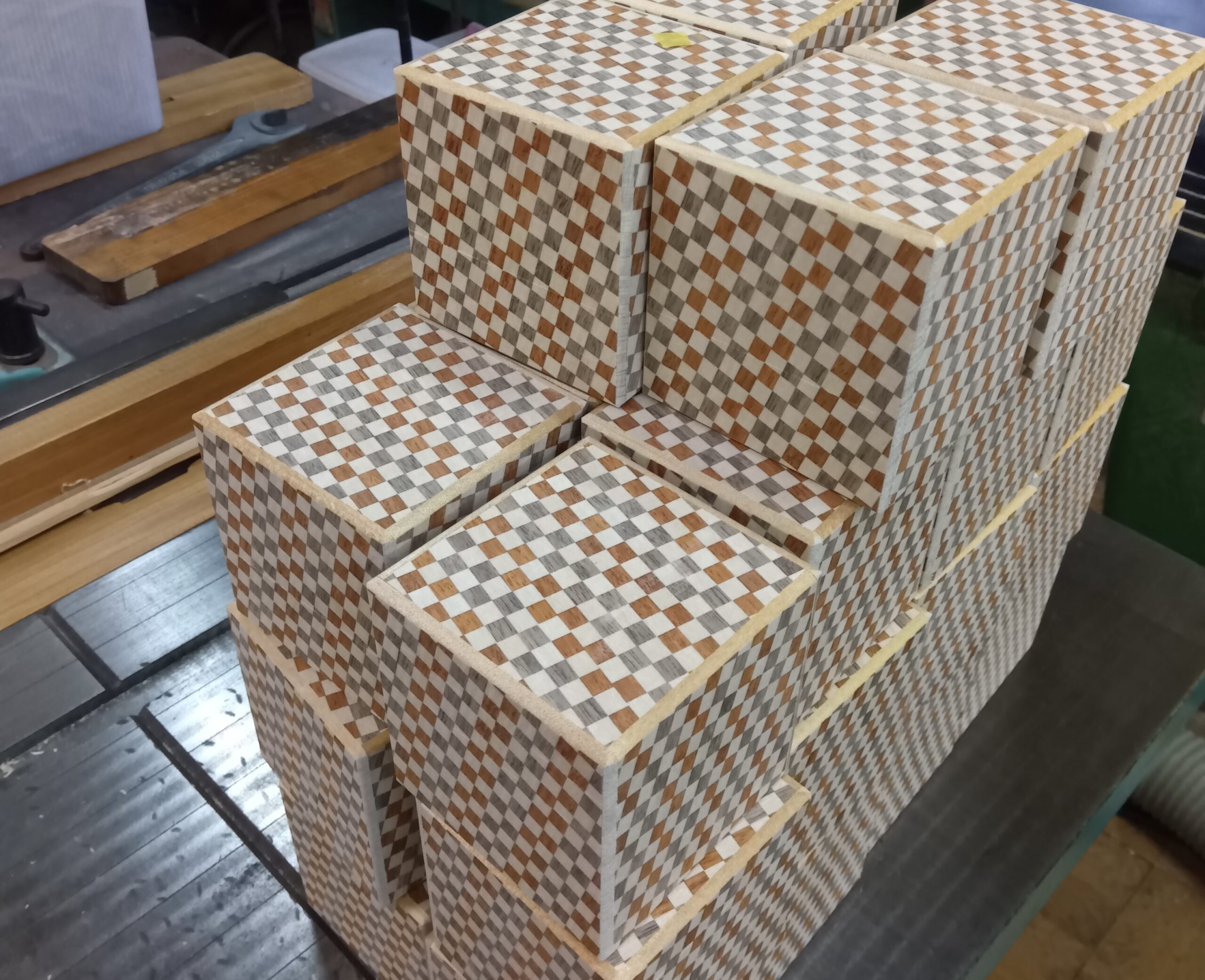All the boxes in this batch have the same checkered yosegi design, so just like with other Japanese puzzle boxes, I round off the corners. After that, I repair any small defects in the yosegi pattern. This time, the checkered pattern turned out really well, but during the slicing process, small chips can still appear in the design. Among the three colors used, the reddish Rengas wood is especially hard and has irregular grain, so it doesn’t slice easily. Generally, harder woods or those with coarse grain are more difficult to slice cleanly. About 90% of the small repairs this time were on the Rengas sections. The repair process is done by cutting a small piece from a spare Rengas sheet to match the size of the missing area, gluing it in place, and then sanding it smooth to blend it in. That’s why it’s essential to keep some extra pieces from the sliced yosegi blocks for future repairs. Most of the damaged spots are about 2 to 4 millimeters in size. Filling those tiny gaps can be tough—especially if your eyesight isn’t as sharp as it used to be 🤣