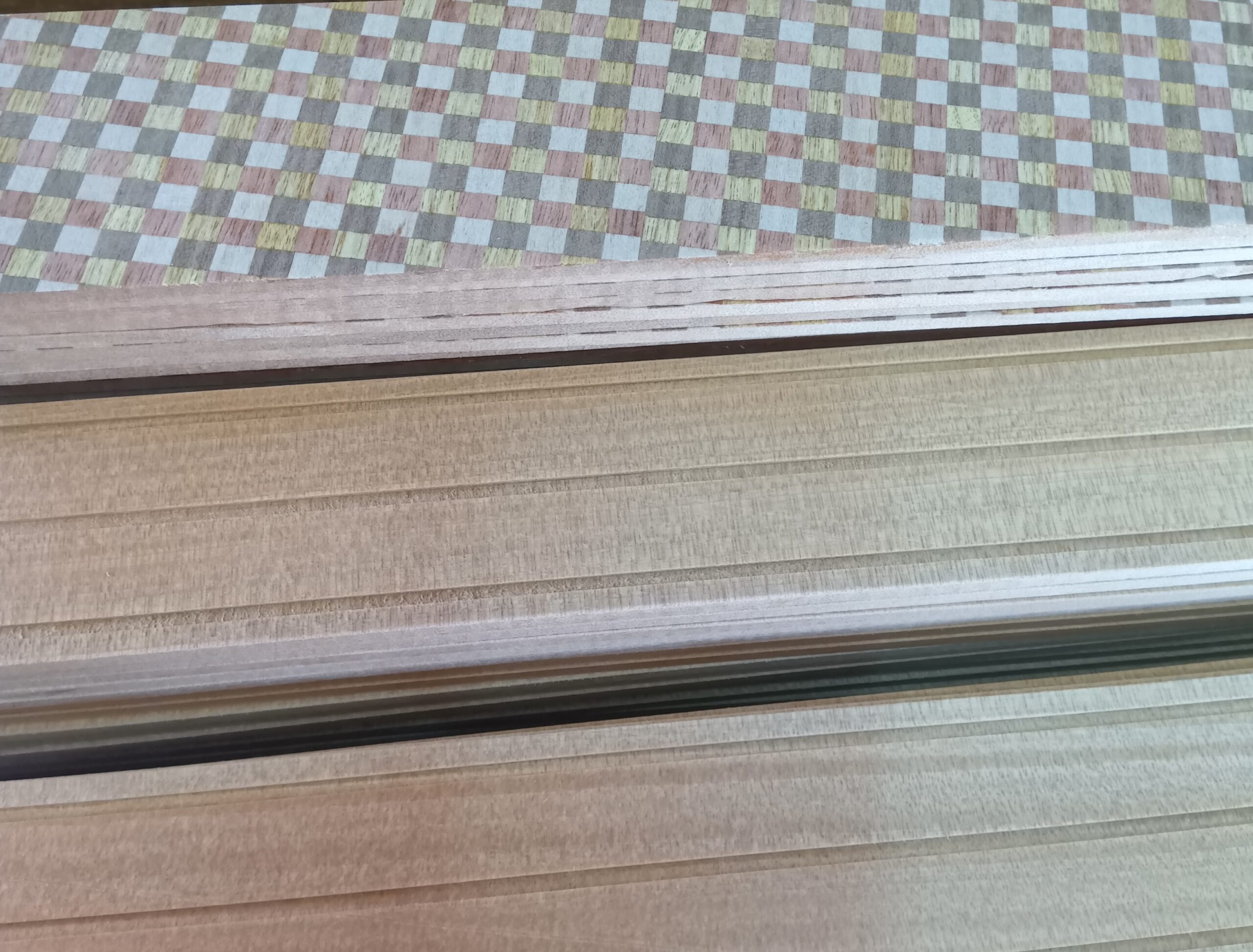 The yosegi sheets have already been applied. Some are traditional yosegi and Ichimatsu patterns, and the rest are planned to be natural wood designs. For now, as I mentioned before, I am planning to use a combination of rosewood and walnut. However, I haven’t fully decided if all of the remaining boxes will use this combination. I may add some limited designs as well. Today, I started with the preparation of the side panels. I prepared both the inner and outer side panels and fixed them with clamps.