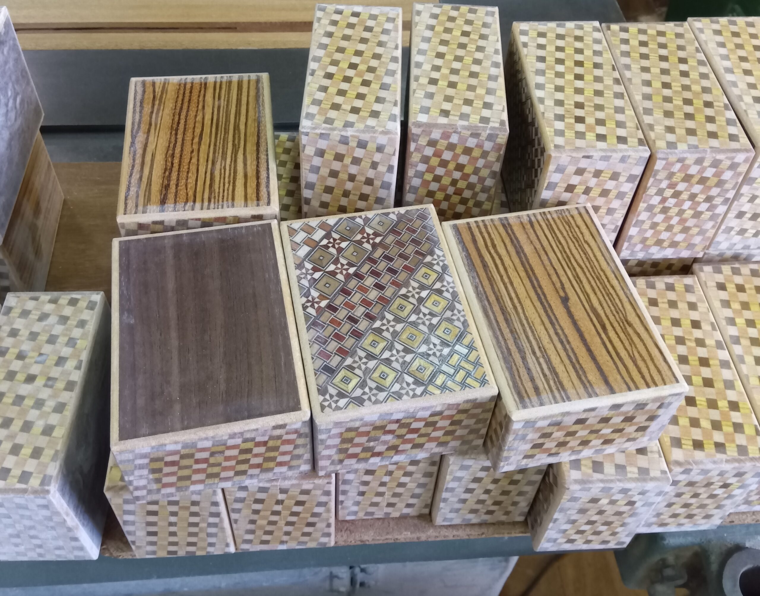 It was warm from the morning today, so it was much easier to wake up. That really helped me. In the afternoon I had a small errand and needed to go out, so I decided not to do any work that would take a long time. My main task today was the final coating work for the 4-sun 27-steps puzzle boxes. Once this process is finished, I can complete the final check. For the 4-sun 14-steps puzzle boxes, I decided to leave the random grain panels I made yesterday for one more day so they can become more stable. Because of that, I did not glue the top and bottom panels today, which is the next step in the process. However, since it looks like it will rain tomorrow and the humidity will probably be high, I did only the cutting work before going out. I cut the panels with very delicate and precise measurements, so when the humidity is high, I worry that the width of the boards will expand. And when the weather clears, the boards shrink again. That small change makes a big difference in this kind of work.