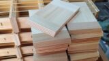 Now that I think about it, I haven’t prepared the walnut sheets for the top and bottom panels yet. After attaching the Aruki panels, the next step will be to glue on the top and bottom panels, so I need to prepare them beforehand. To make these, I’ll glue sliced walnut onto plywood.