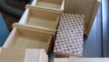 It was raining from the morning today, but as I am writing this, the rain has stopped for now. By the way, today is “National Foundation Day,” which is a public holiday in Japan. I was a little worried about the humidity rising, but I have finally run out of stock of the puzzle boxes with drawers, so I am working a little faster than usual. Even when it rains at this time of year, the humidity does not seem to rise to 70% or 80% like it does in other seasons. At the same time, I am also making a new design type, a combination of traditional yosegi and ichimatsu yosegi, which I have recently been using for other sizes. Today, I made and attached the side panels, which are the outer panels of the Aruki side. The 10-steps puzzle box with drawers has a single solid panel on one side, so it can be glued together at the same time as the sliding key panel on the other side. The 6-sun 7-steps puzzle box I made last year had the same specification, but with such a large size like 6-sun, it was not possible to glue them at the same time. This time, however, since it is 5-sun size, it can be done.
