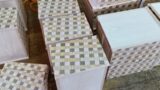 Today, in addition to that work, I also attached some ichimatsu yosegi sheets. This is the process of gluing the sheets onto agathis wood boards. I prepared about 80 pieces. These are for the next project, which will be 4-sun 27-steps puzzle boxes. This time, I am planning to make about 70 boxes in two different designs. The 4-sun 27-steps puzzle boxes are a popular model, but I have not made them recently. It will be the first time this year. These ichimatsu yosegi sheets are for the side panels. Since the side panels need to be completely dry, I attach the sheets at an early stage. When the sheets are glued onto the boards, the boards tend to warp. So it is necessary to let them dry well until the warping settles down.