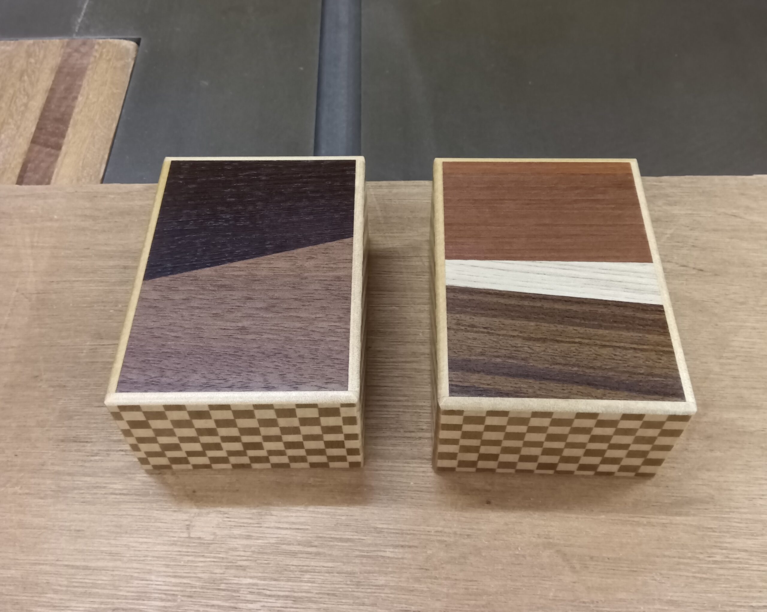 The photo shows the finished 4-sun 14-steps puzzle box in the random grain design. It is the same 4-sun size just like before. It has been a while since I last made this random grain style. For this version as well, I used three different kinds of wood for the top panel. When I made this design last year, I created two color variations. Among them, this color tone was more popular. So this time, I made only four pieces of this type. It is a small number, but once again I felt how interesting this pattern is, both in appearance and in the making process. It has given me motivation for the next production. I would like to try more complex combinations in the future. However, the precision required where the different wood grains meet is a challenge, so I have not been able to attempt that yet. If possible, I would even like to try combining curved shapes, but that would be quite difficult. Still, it is something I would love to experiment with.