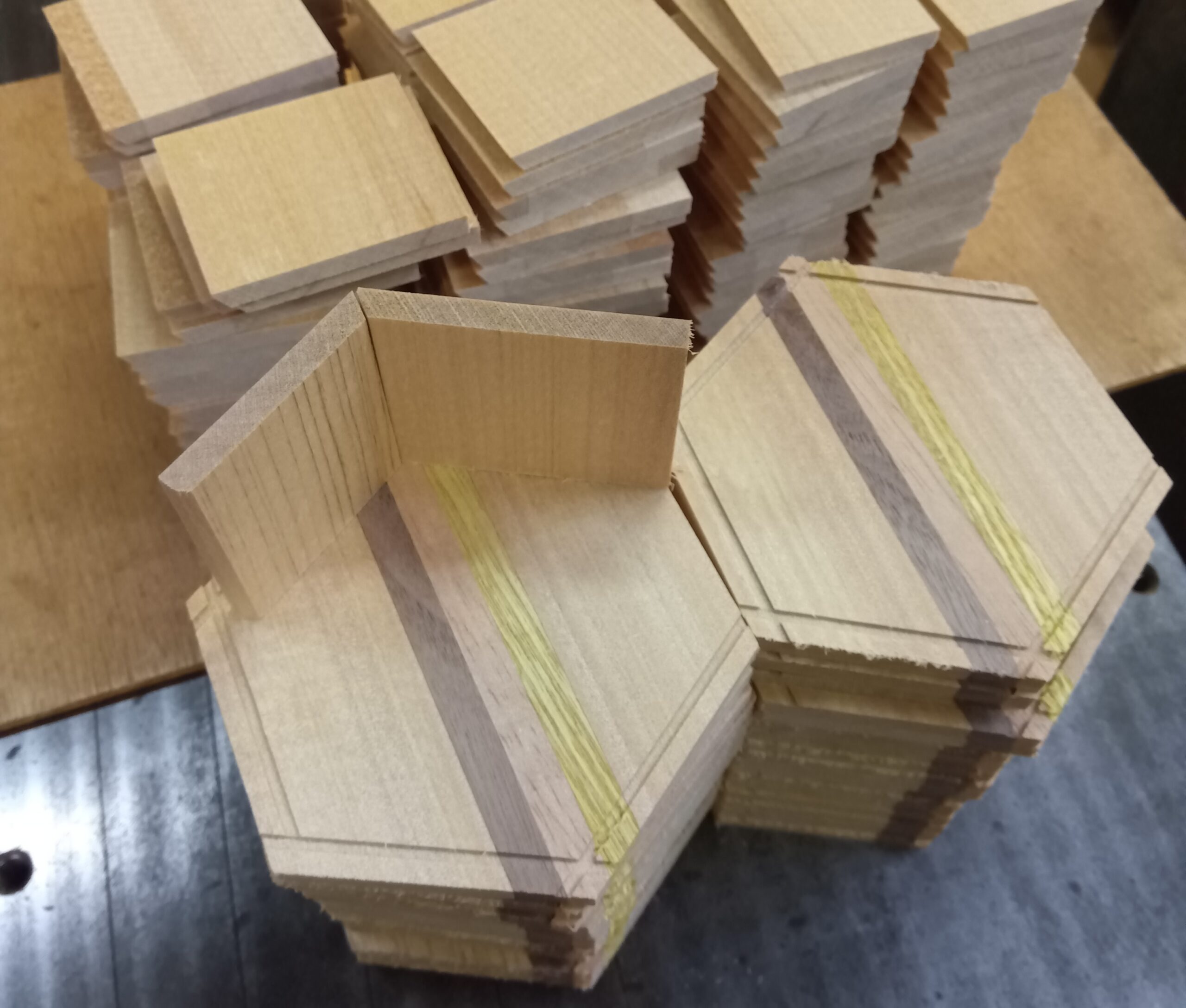 Today, I also made some progress on the hexagonal box (6-steps). I had planned to wait a little longer for the materials to dry, but the panels made from natural wood seemed ready to use, so I decided to start working little by little. As shown in the photo, today I made the top and bottom hexagonal panels and the internal shaft panels. As I mentioned before, I first cut out the hexagonal shapes and then add grooves to them. Each hexagon has grooves on five of its six sides, leaving one side without a groove. That ungrooved side becomes the fixed panel, which is the bottom of the box. Among the five grooves, one of them stops partway instead of going all the way through, and the side with that groove becomes the lid of the box.