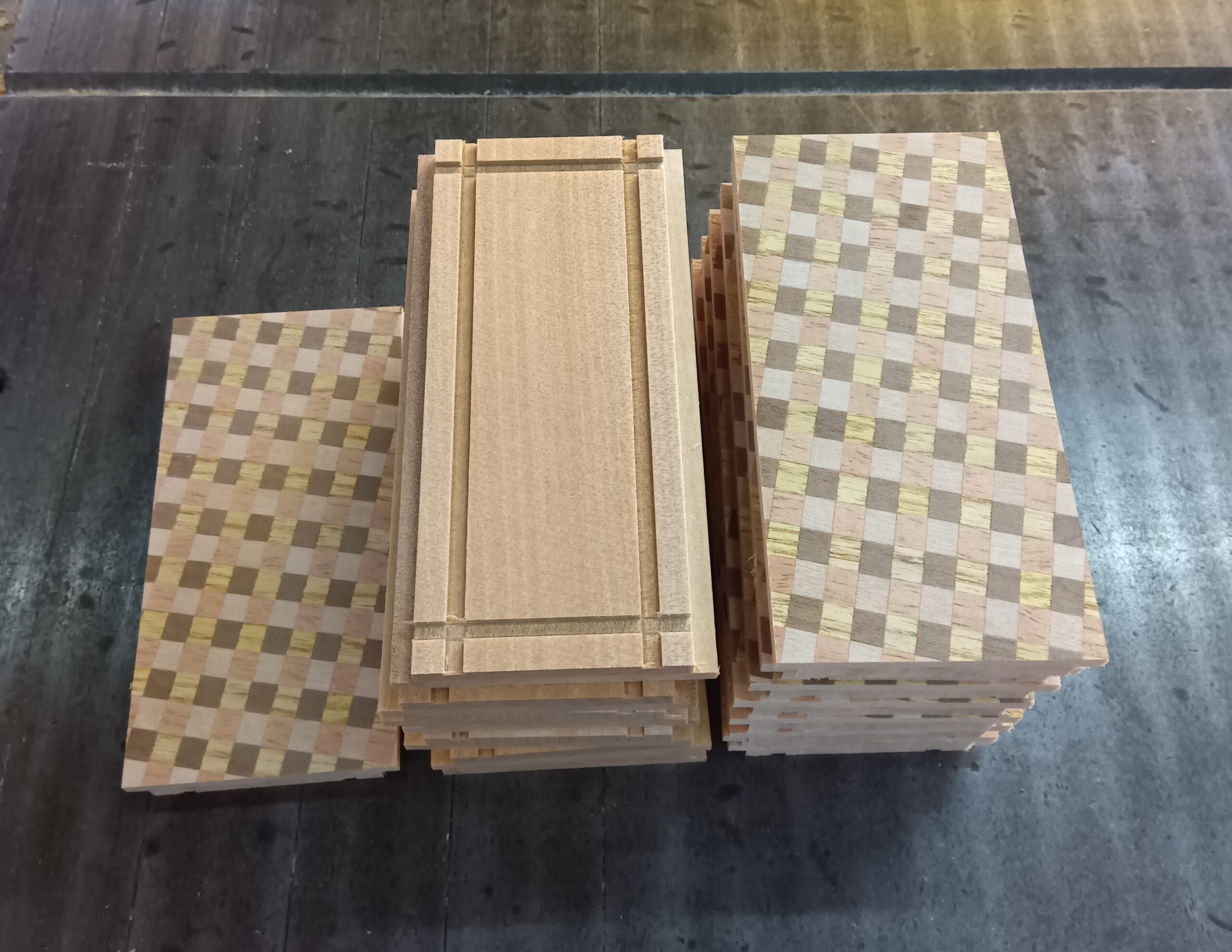 This time, about 50 of the 27-steps puzzle boxes are already ordered, but I will make a few extra, so I am thinking about what designs to choose. For now, I plan to make a few in the “random grain” style that I made last year. Since one of the ordered boxes uses zebrawood for the top and bottom panels, I am also thinking of making a few extra with zebrawood. Recently, I often use walnut, zebrawood, or rosewood for the top and bottom panels. Somewhat surprisingly, zebrawood is quite popular. Maybe its bold and unique appearance appeals to people. This time, I purchased the sliced wood sheets newly from a supplier who specializes in sliced wood veneer.