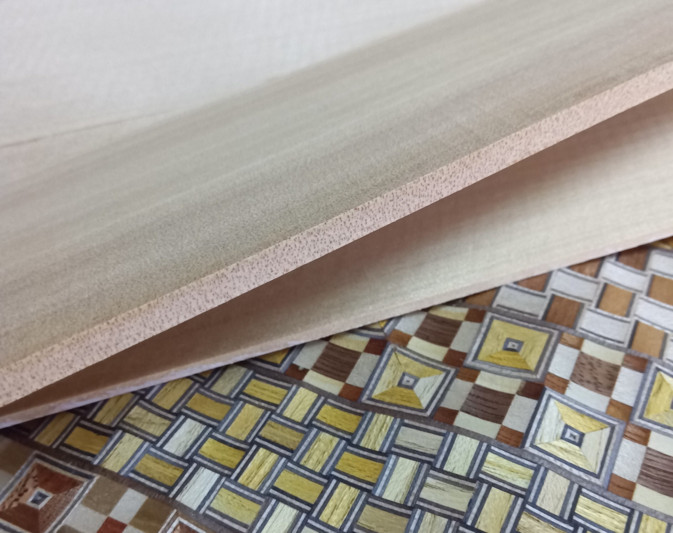 Before starting the 4-sun work, the humidity was still high in the morning, so I worked on the next project, the Mame (tiny 1-sun) puzzle boxes with 10 steps, and glued the yosegi sheets onto the boards. I had already prepared the boards yesterday. I planned to glue them yesterday, but because of the rain I was in a relaxed mood and decided not to do it in the end 🤣 It has been a while since I made the 10-steps type. I will make about 100 of them for a request from the Hakone market. This Mame puzzle box uses traditional yosegi on all sides, so I glued yosegi sheets for every surface. In the photo, you can see the boards and the yosegi sheets. If you look closely, the slightly thicker board at the top of the photo, about 4 mm thick, will become the long side of the box. The thinner board at the bottom of the photo, about 2 mm thick, will become the top and bottom panels and the short side panels, which are the side Aruki panel surfaces. When I glue the yosegi sheets, the boards bend a lot, especially the 2 mm boards. They absorb moisture from the glue and curve strongly. To calm them down, they need enough drying time, stacked flat and left to rest. These boards will probably take some time to dry, so while I wait, I may start another project.