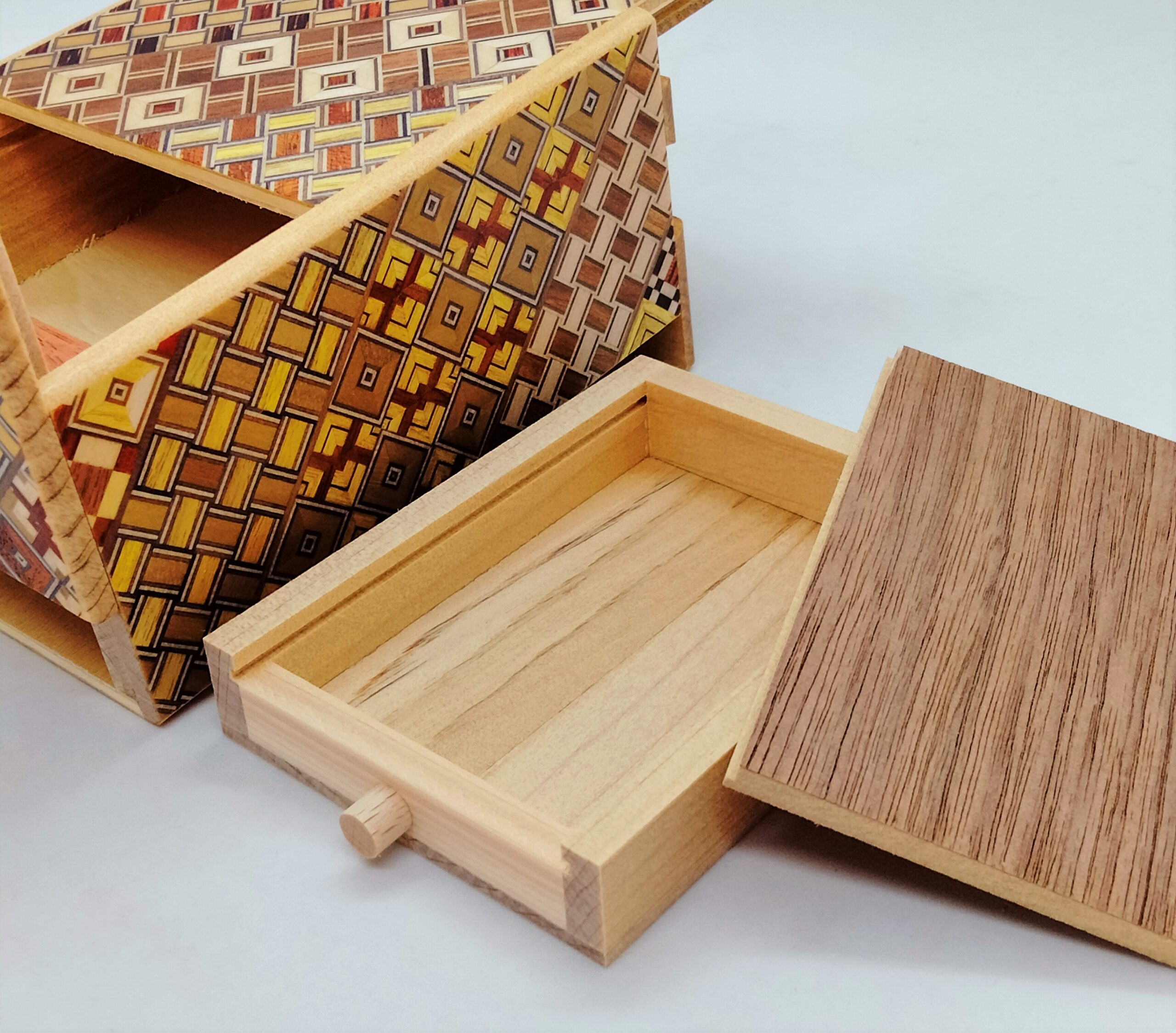 I also make the drawer parts as thin as possible. The drawer lid is about 4 mm, and the bottom plate is 2 mm. With small drawer puzzle boxes like these, there is the option of leaving out the lid since the drawer is so small (and thin). But I feel that wouldn’t be interesting. It’s important to make them in the same way as a standard 10-steps drawer puzzle box. So, since I made the box itself 1 mm taller this time, I may also make the drawer 1 mm taller.