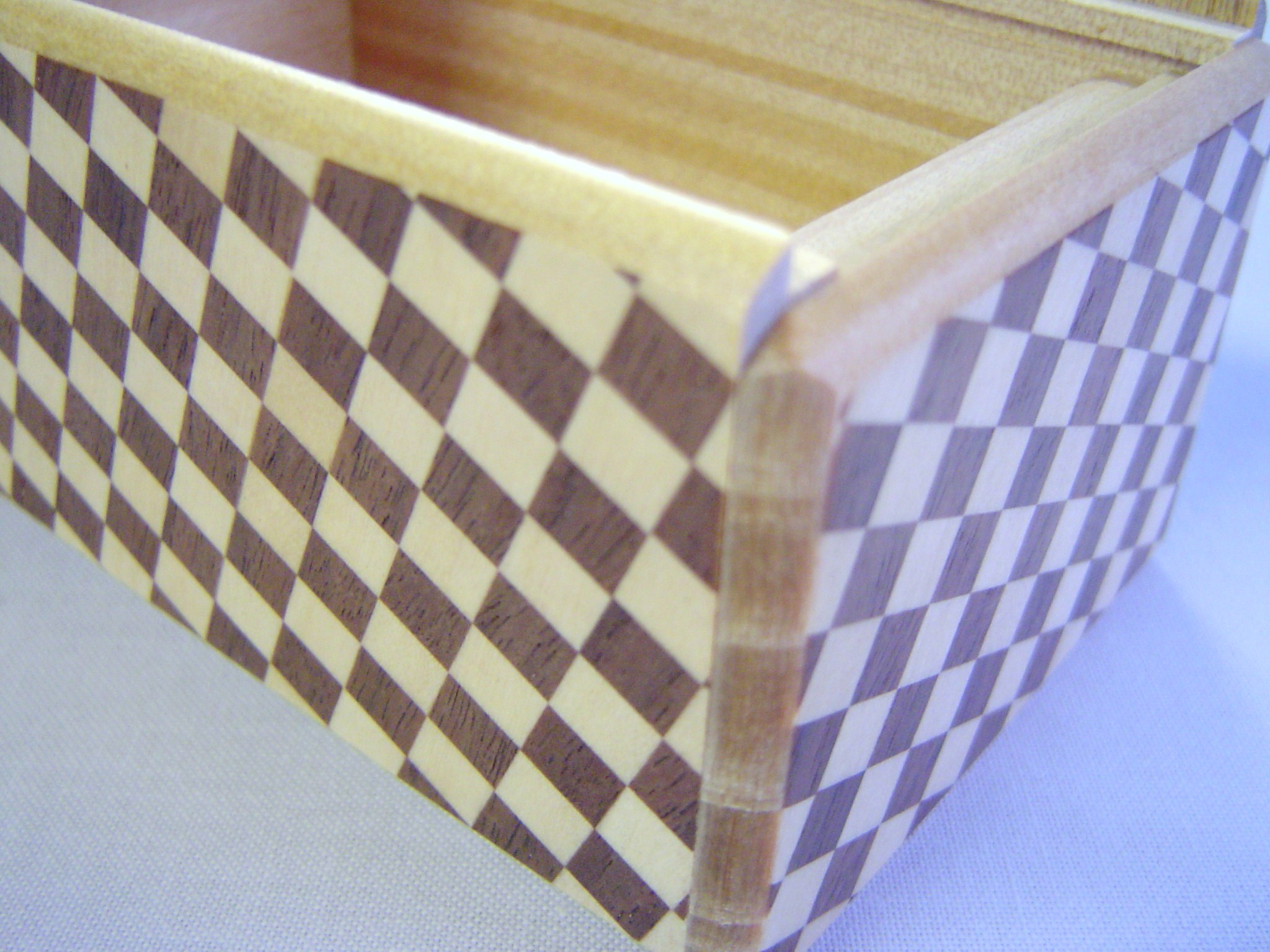 Recently I have not made them, but the boxes made from only one kind of wood (especially Walnut) are very popular. As I wrote before, this Ichimatsu pattern is the non-diagonal type, which gives a stronger sense of Japanese style. However, attaching it requires more care, because I have to make sure the pattern does not become diagonal when gluing it.