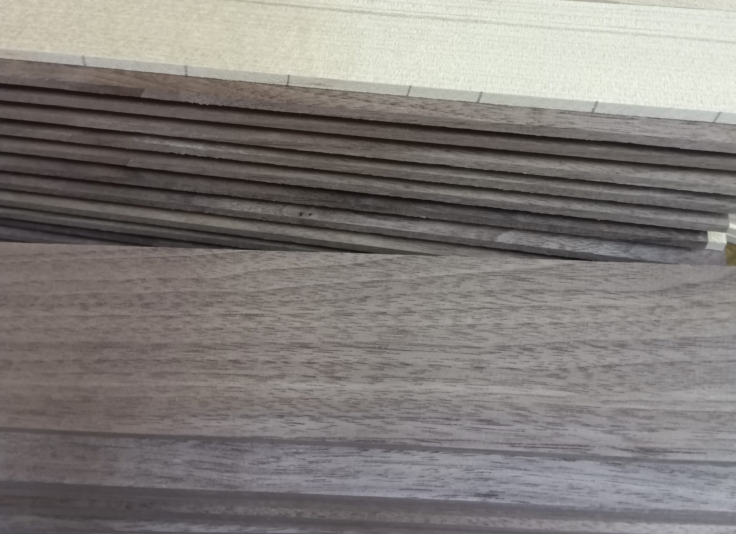 I also prepared for the next production today (photo). The next boxes I will make are 3-sun 12-step puzzle boxes. I received an order for a good number of them, so I will focus on making those. I may be able to keep a small number for stock as well.This time, the design has traditional yosegi on the top and bottom, with walnut wood used for the side panels. I have made this model many times before, and it is a popular one. In fact, I have received requests for the same box from other people as well, but this order was placed last year, so I am making this one first. Because the quantity is fairly large, I plan to make only this order for now. I will start working on the other requests again soon. Today, I attached the side panels. Walnut wood is more likely to warp than boards with yosegi attached, so it is better to fix it with clamps for a slightly longer time. I would like to use walnut with straight and calm grain as much as possible, but in recent years walnut wood has become very expensive, so it is not always easy to use only the best parts. Even so, I carefully select the wood, using the best grain for the side panels of the box and also choosing good grain for the sliding key panels. Come to think of it, it feels like it has been a long time since I last made a box using walnut wood.