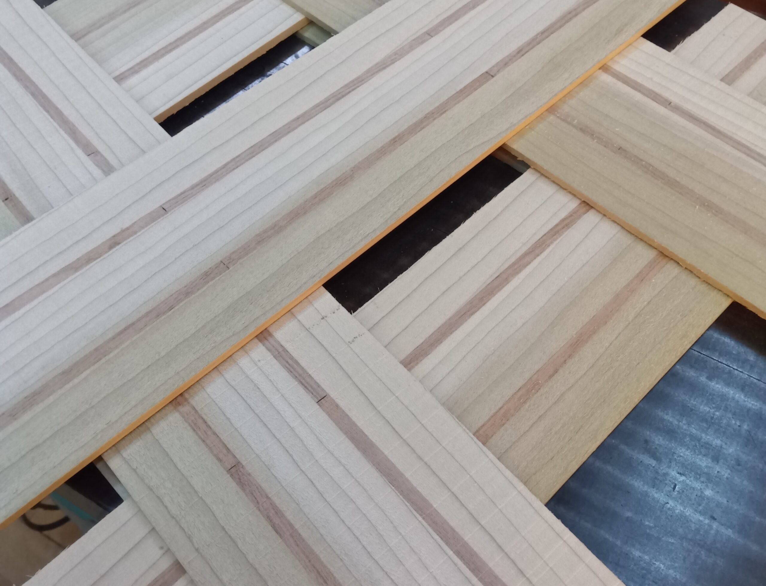 And this time, I decided to use a “random grain” design again for the bottom panels by combining two types of wood. I will be using materials purchased from a new supplier, and I plan to use those for this project. The two woods are walnut and makore. I haven’t seen the materials yet because they haven’t arrived, so I don’t know exactly what they look like, but I hope they will be easy to work with. The reason is that the materials used for the random-grain pattern can differ depending on the woodworking company, and sometimes they don’t match well with the glue I use. I was told that the materials this time should be fine, but I won’t know for sure until I actually try. I’m half excited and half a little worried. I’ll update you again once I know more.